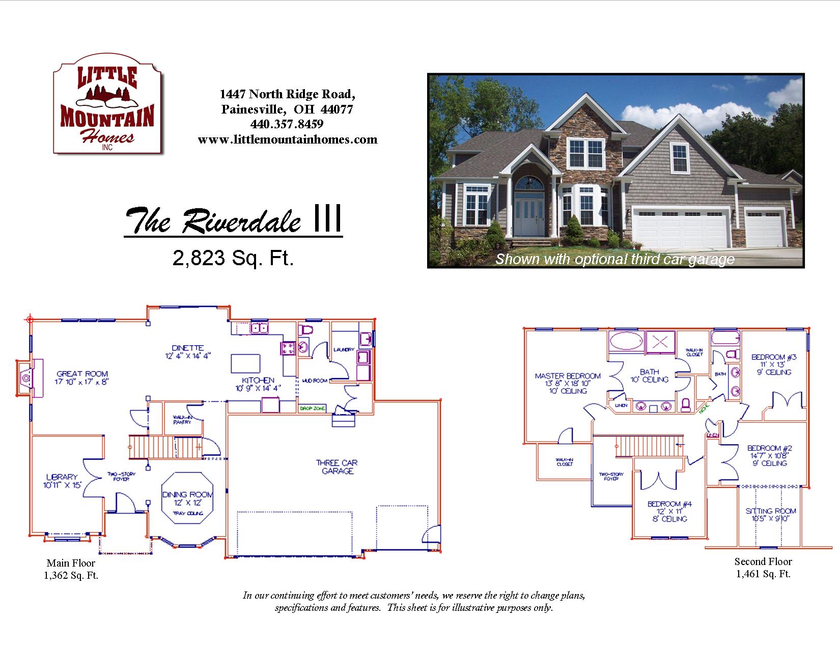 The “Riverdale III” colonial design features 4 bedrooms, 2.5 baths, gourmet kitchen with work island, dinette, formal dining room, library/office, greatroom with fireplace, first floor laundry and optional 3-car garage (shown). 2,787 sq. of living area.